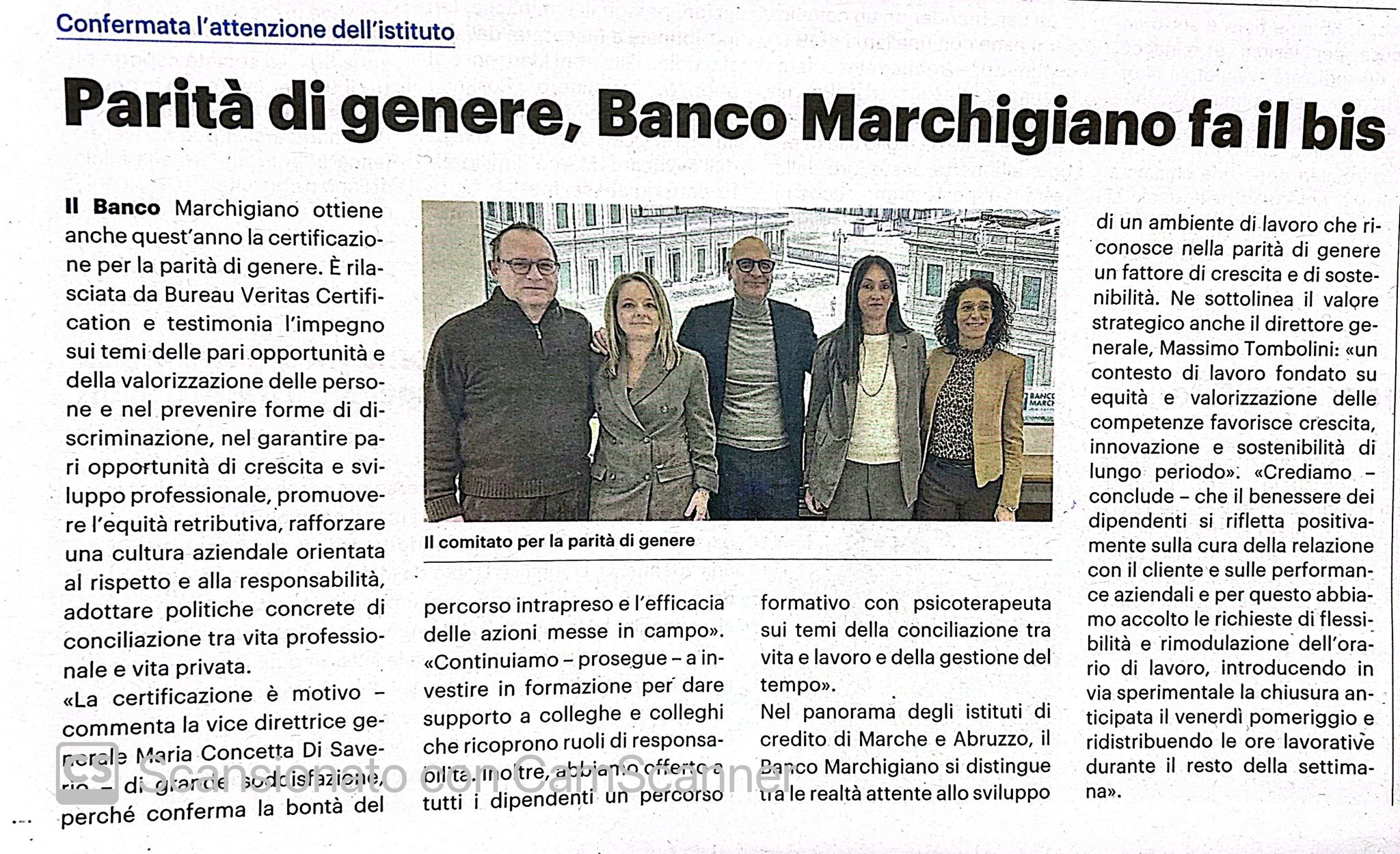 Parità di genere, Banco Marchigiano fa il bis.